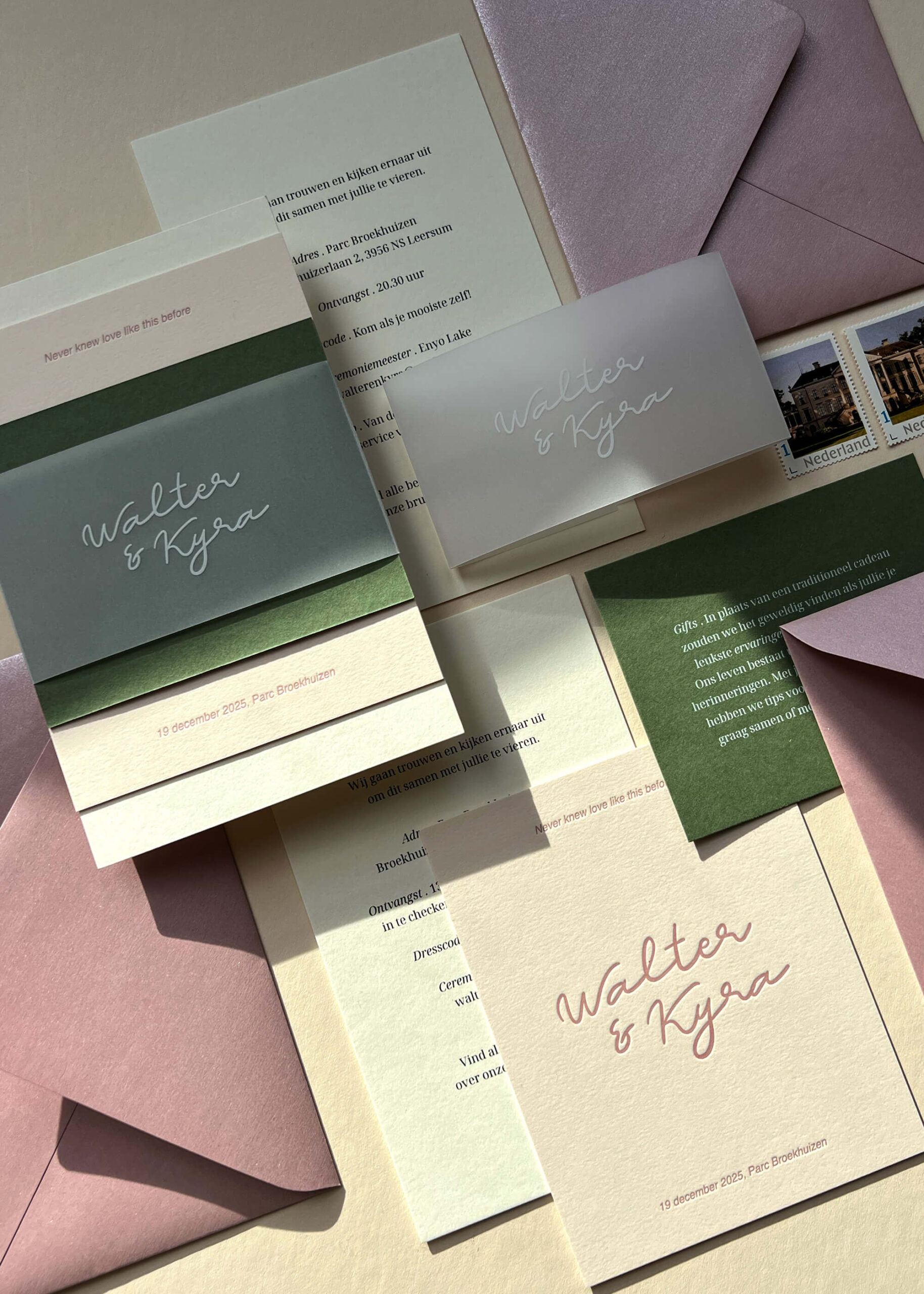 Three time's a charm! Anakim en Carmen moesten hun bruiloft noodgedwongen drie keer verplaatsen; maar nu was het dan eindelijk zover. Om dit driedubbel te vieren kozen ze voor een drieluik in zachte aardetinten, een custom illustratie van de trouwlocatie én een plattegrond.